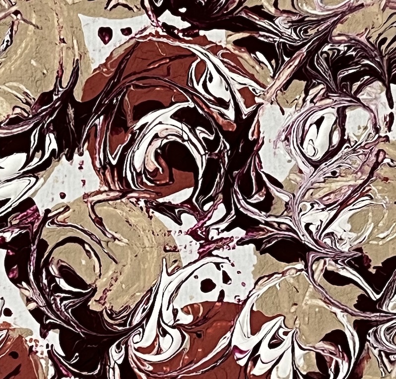 深みのある赤ワイン色の渦が織りなす美しいコントラストが、見る人を魅了する作品です。この独特の配色は、まるで時空を超えた旅を果たすかのように、心に深い感動を与え、無限の物語を語りかけてきます。混沌とした中に隠れた調和が、内なる探求を促し、豊かな色彩が心の奥深くに響き渡ります。