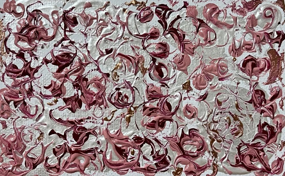 パールホワイトに重なる薔薇色の渦が、深いアメジストの陰影とブロンズの細い光を纏いながら優しく漂います。厚塗りのうねりが花弁の記憶のように重なり合い、静かな画面の中でゆっくりと溶け合う様子は、薄暮の庭に残る甘い余韻を思わせます。このキャンバスは、心の奥にそっと忍び寄る、儚くも温かな懐かしさを永遠に留めています。