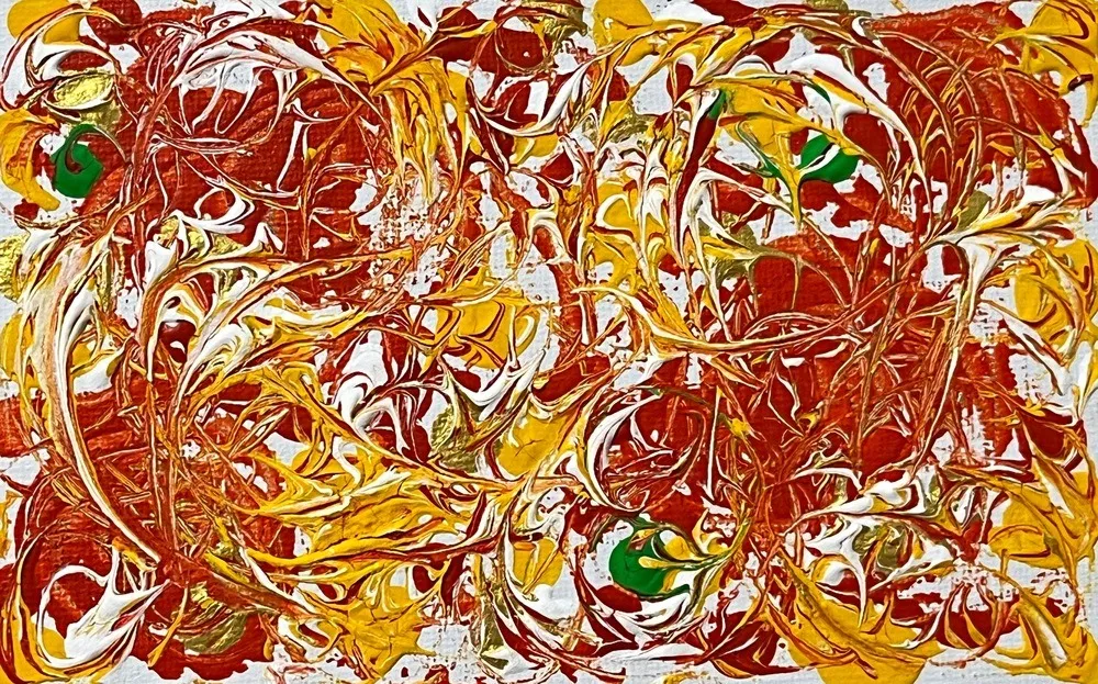 サフライン色に重なる赤とゴールドの輝きが織りなす神秘的な舞が、見る者を惹きつける魅力的な作品です。このユニークな色合いは、まるで炎の中に秘められた感情を映し出すかのように、心に深い感動を呼び起こし、無限の物語を語りかけてきます。混沌の中から浮かび上がる調和のダンスが、内なる探求の旅を促し、豊かな感性が心の奥深くに響き渡ります。