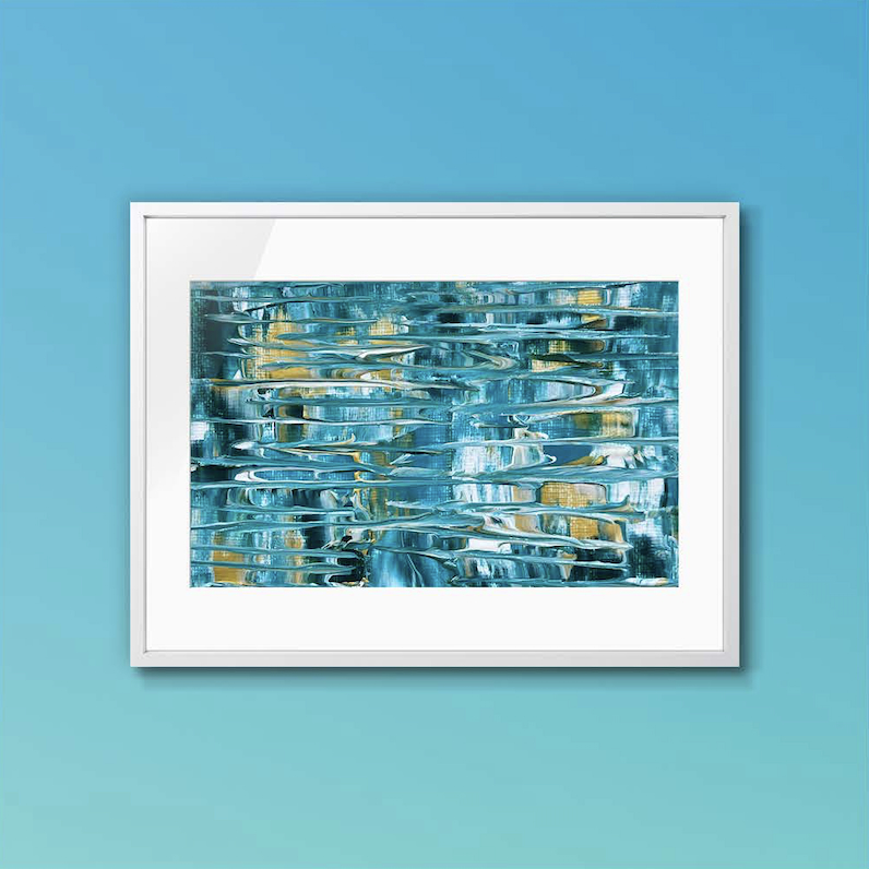 柔らかなターコイズブルーの層に、金色の光が優しく透けるアクリル抽象画です。海の深みから差し込む陽光のように、穏やかで希望に満ちた輝きが広がります。心に静かな癒やしを演出する、詩情あふれる一枚です。
