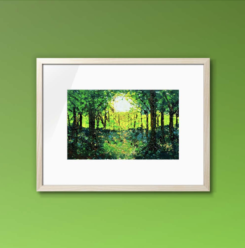 新たな始まりを告げる朝の光が、穏やかな緑の風景に差し込む作品です。柔らかな光が葉の間をぬって、まるで新しい旅立ちを迎える瞬間を映し出します。この作品は、心の奥深くに安らぎを与えつつ、優しくて力強い色彩が織りなす美しさは、穏やかな時間の流れの中で感じられる自然の穏やかさを実感させてくれます。